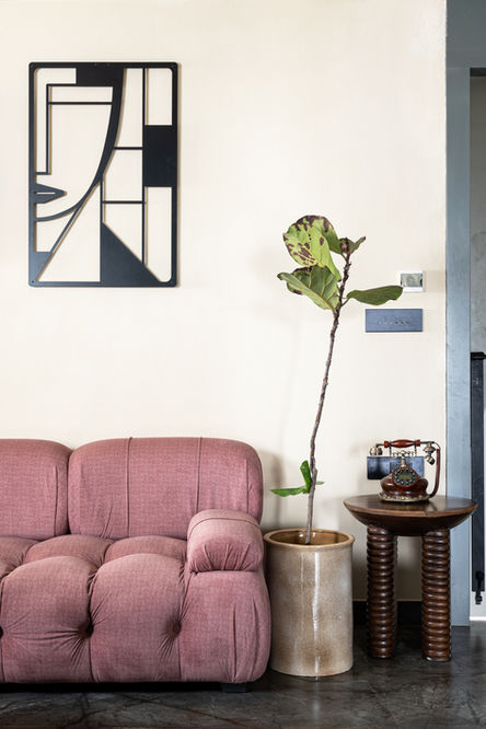 In the living room, a sense of welcoming comfort prevails, created by an eclectic array of pieces from Sage Living, House of Things, and Dtale Modern, alongside handcrafted furniture built on-site. The room exudes a happy, inviting vibe, making it a perfect gathering space.